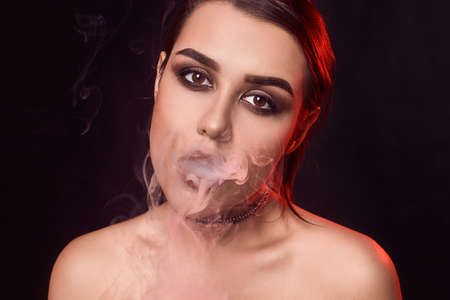 Portrait of glamour seductive gorgeous brunette woman smoking electronic cigarette in studio