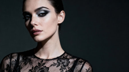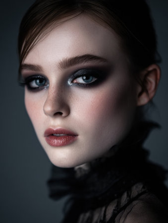 Beauty portrait highlighting dark gray smokey eyeshadow, defined sculpted features, deep eyebrows, and heavy false eyelashes against a low-key background.
