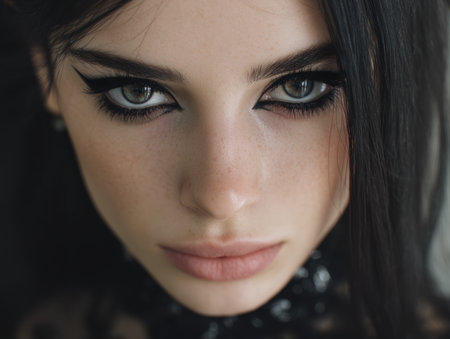 A close-up view of a woman with long dark hair and dramatic makeup showcasing her intense gaze. The focus is on her captivating expression and strong facial features that draw attention.