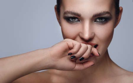Interesting fashion model and strong makeup on her face. Horizontal studio shot.