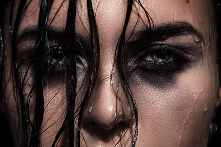 Close-up of wet female face with a smeared makeup