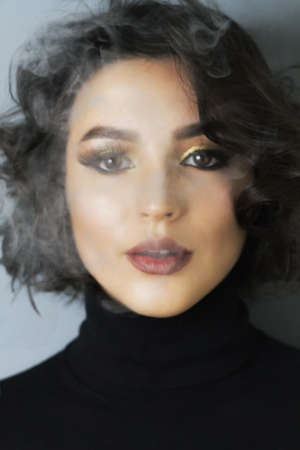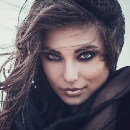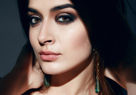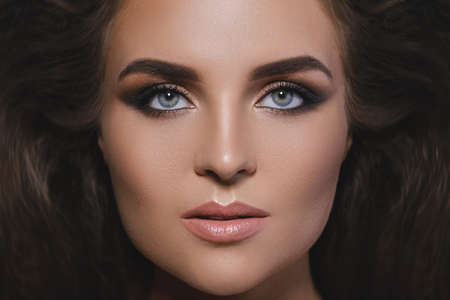 Beautiful woman with brown hair. Attractive model with brown eyes. Fashion model with a smokey makeup. Closeup portrait of a pretty woman looks at camera.