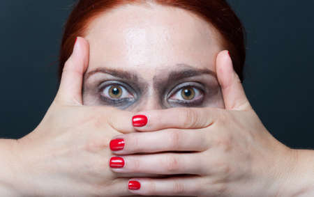 Close-up of female model with smeared mascara looking surprised and covering her mouth