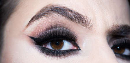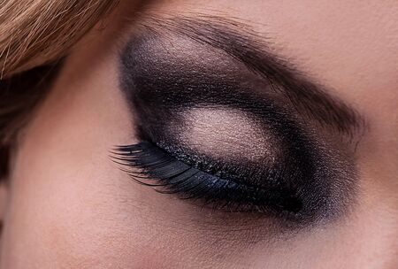 Closeup shot of woman eye with evening makeup. Long eyelashes. Smokey Eyes