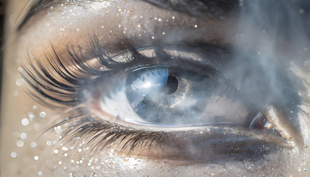 A close-up of a sparkling eye with long eyelashes surrounded by soft glitter, showing an artistic and dreamlike concept.