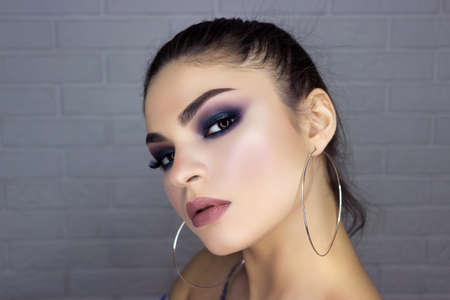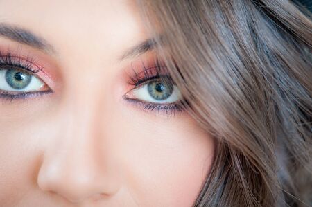 Close-up portrait of beautiful young woman with blue eyes and professional makeup