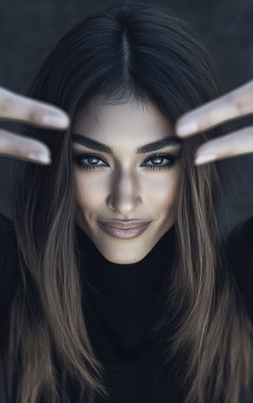 A confident woman with long dark hair and striking facial features poses elegantly against a dark background. Her captivating gaze and playful gesture draw attention and evoke intrigue.
