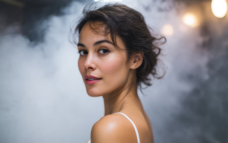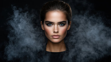 A breathtaking portrait of a beautiful woman set against a dark background, with soft smoke enveloping her. The image captures elegance, confidence, and artistry.