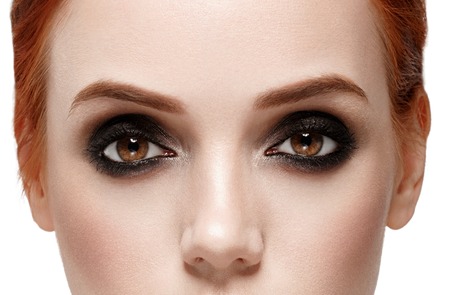 Eyes woman. Smoky black make up on eyes. Beautiful portrait. Close up view. Isolated on white.