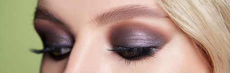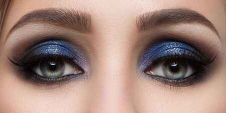 Brown smokey. Blue eyes. Eye makeup. Beautiful eyes make-up. Holiday makeup detail. Long eyelashes. Close-up shot of female eye make-up in smoky eyes style
