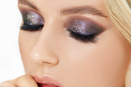 Beautiful woman with long eyelashes and with beautiful smokey eyes make-up. Closed eyes close up.