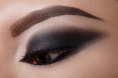 Macro beauty closeup of woman eye with intense smoky shadows and smudged eyeliner. Perfect for gothic fashion, Halloween makeup, club party style and dramatic artistic visuals