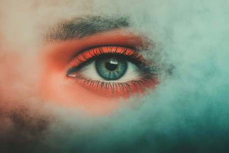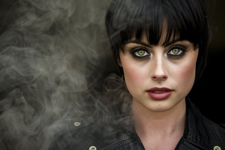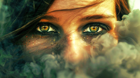 A young womans face with smoke billowing out of her eyes in a mysterious and dramatic display.