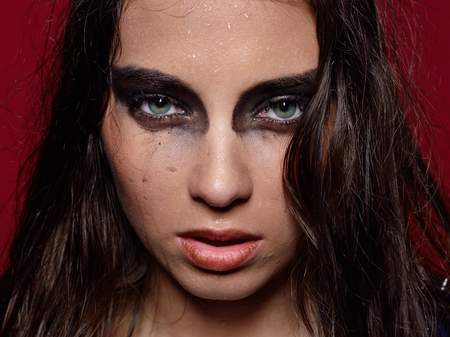 Head portrait of the beautiful woman with wet stage make up in studio with red background.
