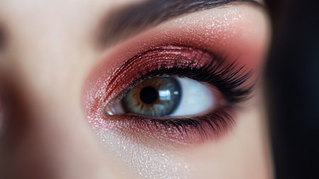 A detailed shot of a woman face with expertly blended eyeshadow and mascara, showcasing the elegance and precision of her eye makeup.