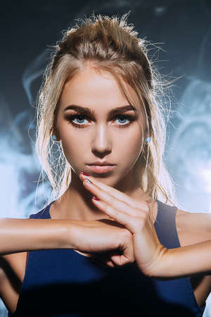Beautiful young model, longhair girl with bright make-up, smoky eyes