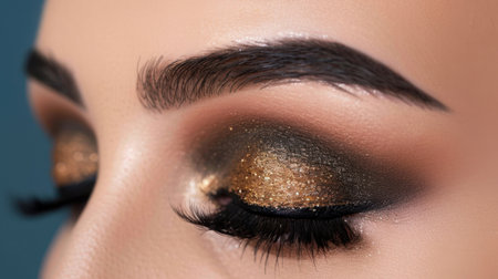 A stunning close-up of glamorous eye makeup featuring golden glitter and dramatic lashes, highlighting artistry and beauty trends in contemporary cosmetics.