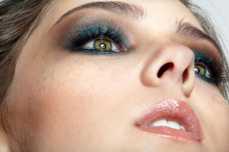 beautiful young model with green-brown smoky eyeshadow evening make up, perfect skin. Close-up face portrait