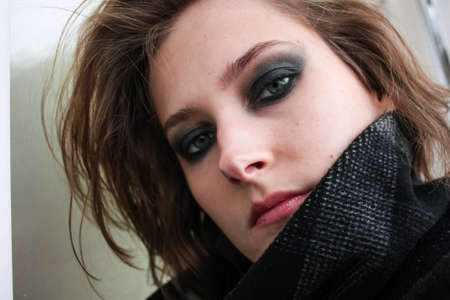 Young woman in coat with dark smoky eyes makeup close up portrait