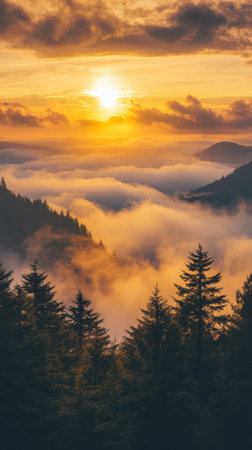 Experience the breathtaking beauty of a misty mountain landscape, where fog gently rolls over hills and trees, creating a serene and tranquil natural scene.