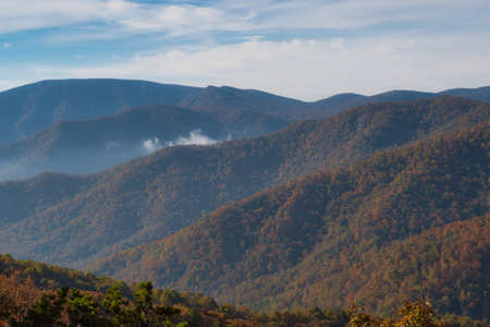 Blue Ridge Parkway Scenic Autumn Landscape with sunbeams over mountains w/ fall foliage