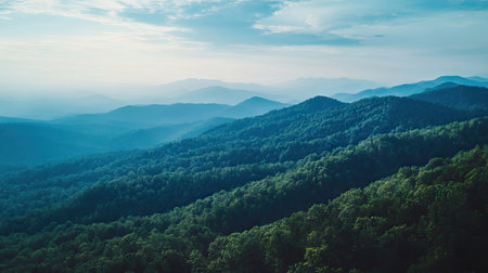 Breathtaking Hazy Blue Ridge Mountains Landscape with Silhouettes and Soft Sunset Glow Over Valleys