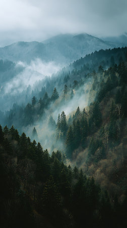 Atmospheric mountain vista featuring layers of forested hills shrouded in mist. Evergreen trees stand out amid the fog, creating a serene and moody forest landscape.