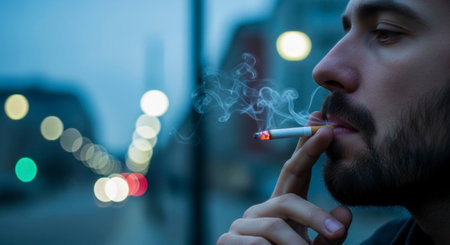 Profile view of a bearded man smoking a cigarette, exhaling smoke into the air. The background features soft, blurred bokeh lights, indicating an urban setting during evening or night.