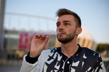 A handsome young dark-haired guy with a white sweater smokes a cigarette, exhaling harmful blue smoke. Dependence on nicotine. A bad habit.