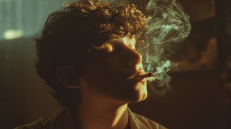A young man sits calmly, smoke curling from a cigarette in his mouth, lost in thought, as soft light envelops him, creating a warm and intimate atmosphere.