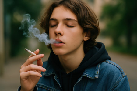 A young man stands on a street, smoking a cigarette and lost in thought. He is wearing a denim jacket and hood.