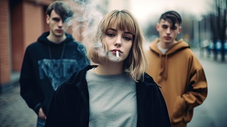 Group of teenagers smoking cigarette outdoors. Social issues between young people. Generative AI.