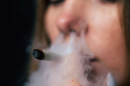 a joint in hand A woman smokes cannabis weed, . Smoke on a black background. Concepts of medical marijuana use and legalization of the cannabis. On a black background