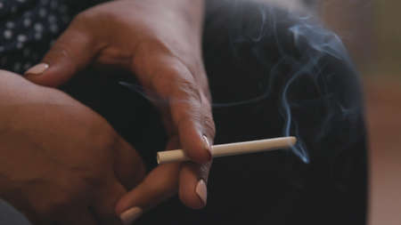 Close up of hand of fifty year old woman smoking a cigarette. Stock footage. Hands of senior woman with white manicure holding smoking cigarette, concept of fatigue.