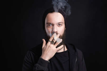 handsome Brutal bearded smoking man in Hat. Hipster boy with cigarette and rings on his hand