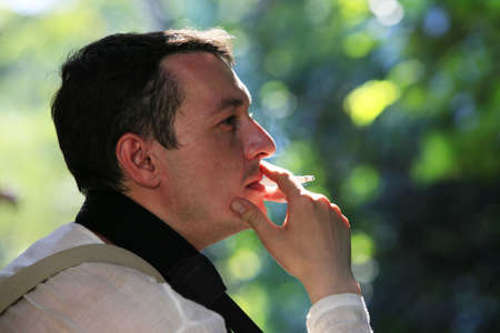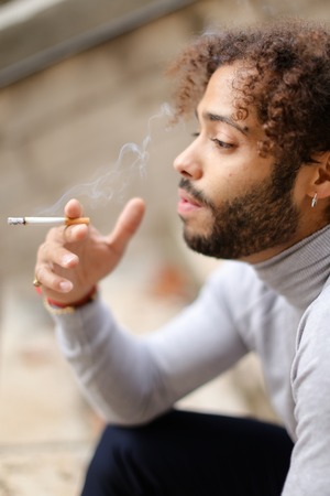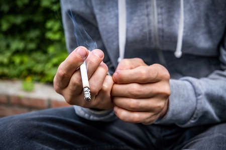 Smoking problem, addiction to nicotine concept. Adult man holding and smoking cigarette outside.
