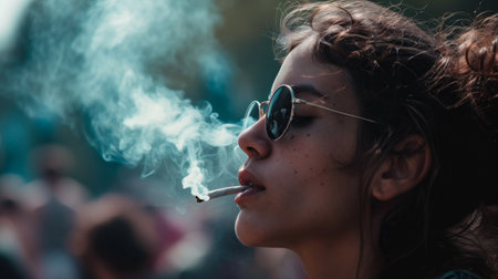 A woman is seen smoking a cigarette against the backdrop of a bustling city. The woman is sitting or standing while holding the cigarette, with buildings and urban infrastructure visible behind her. Generative AI