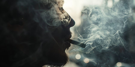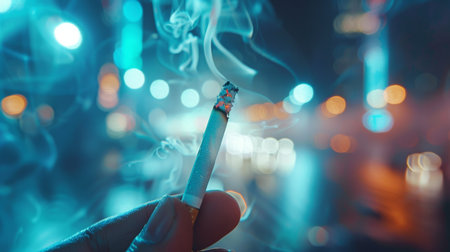 Cigarette smoke billowing from a lit cigarette held between two fingers, with a blurred urban background.