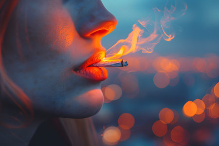 Close up portrait of a woman smoking, highlighting her lips and cigarette, evoking feelings of contemplation with a dark background