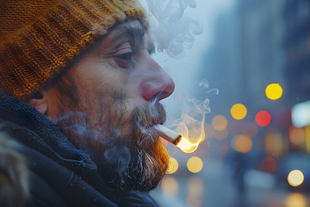 Urban Winter Evening: Bearded Man Smoking in Cold City Lights