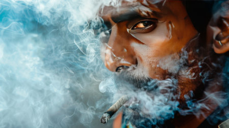 A man is smoking a cigarette and the smoke is billowing out of his mouth