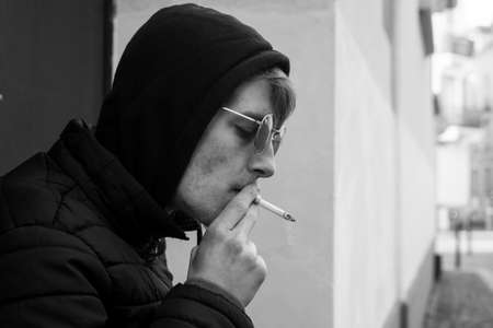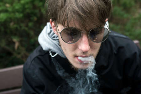 Portrait of young man with sunglasses smoking a cigarette in the street
