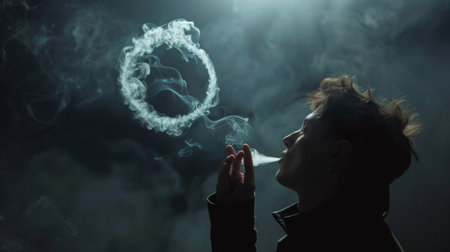 A person blowing a smoke ring in a dark room, with the ring floating gracefully through the air.