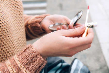 A young woman in a beige warm, cozy, knitted sweater holds a mirror and lip gloss in her hands. Woman applying makeup on the street. Express makeup