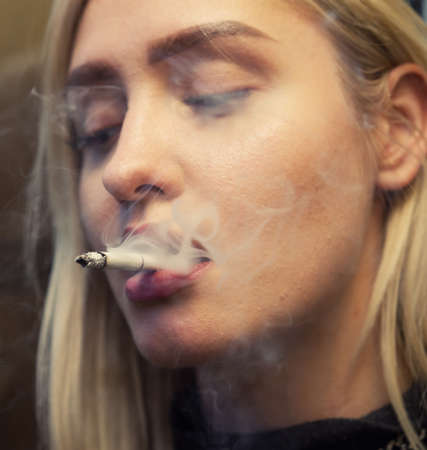 Don't use drugs! Closeup detail view of portrait of exhausted young addict junkie girl, extremely bad and unhealthy looking, smoke marijuana ganja or hashish joint. Concept of narcotic addiction