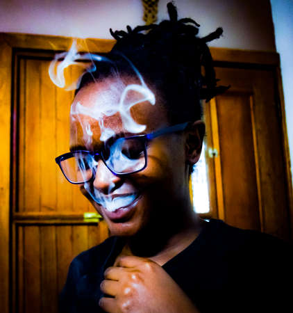 A man smokes cannabis weed, a joint and a lighter in his hands. Smoke on a black background. Concepts of medical marijuana use and legalization of the cannabis. On a black background