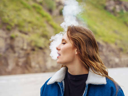 Vape teenager. Young pretty white caucasian girl with glasses on her head an electronic cigarette on the street in the summer. Deadly bad habit.