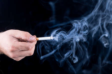 hand hold a burning cigarette in smoke on a black background copy space. close up