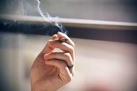 The hand of a man with a blue ring on his finger holds in his fingers a Smoking cigarette, illuminated by sunlight.