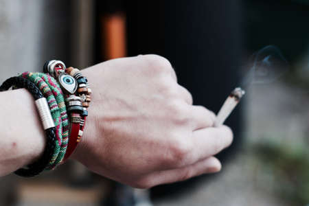 Close up man hand with burning cigarette.Blurred image,